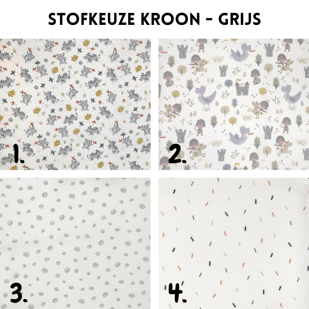 De kroon is gemaakt uit een katoenen stof naar keuze en een grijze achterkant. De sluiting is afgewerkt met linten, dus geschikt voor elke leeftijd.